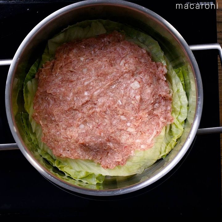 4: 鍋の底にキャベツの葉を敷き詰め、その上に肉だね(1/4程度)をのせます。キャベツと肉だねを交互に重ねます。