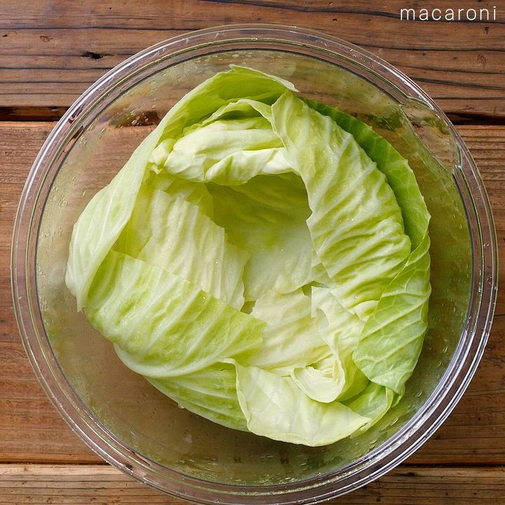 2: 耐熱ボウルにキャベツを入れ、ラップをかけてレンジ600Wで4〜5分加熱します。