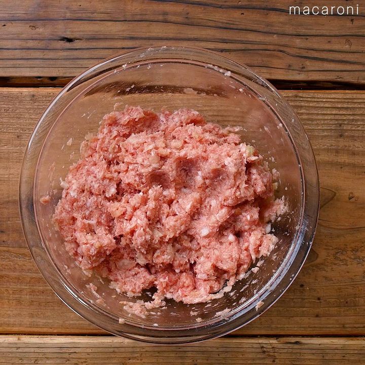 ※手の温度で肉だねが温かくならないよう、手早く混ぜます。