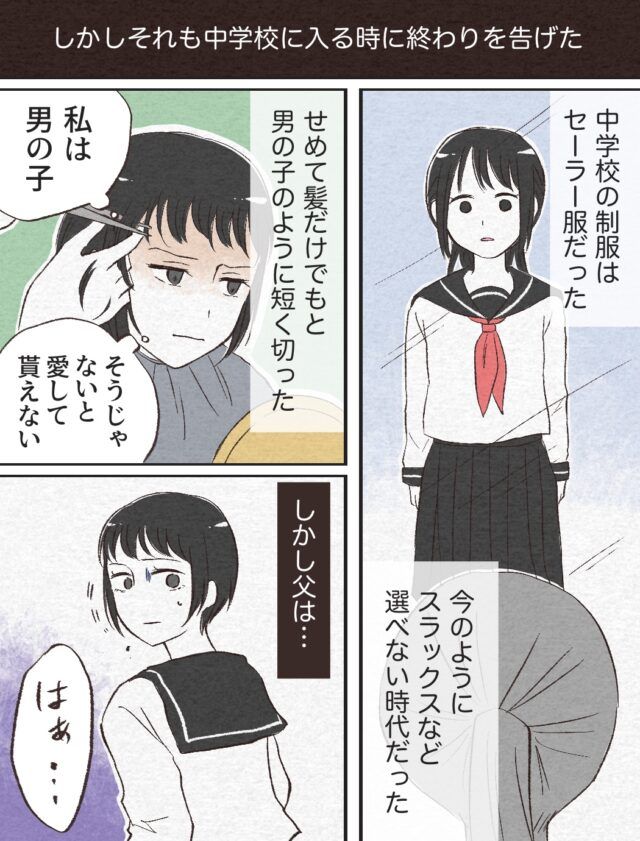 男の子のように活発に遊び回る小学生時代を過ごした奈々さん、でもそれも中学校に入る時に終わりを告げました。中学校の制服はセーラー服、今のようにスラックスなどを選ぶことはできませんでした。奈々さんは「せめて髪だけでも」と男の子のように短く切りましたが、お父さんにため息をつかれてしまいます。