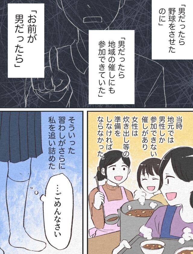 「男だったら野球をさせたのに」「男だったら地域の催しにも参加できていた」「お前が男だったら」と父が嘆くのを聞いて悲しい気持ちになる奈々さん。当時、奈々さんの地元では男性しか参加できない催しがあって、女性は炊き出しの準備をしなければならず、そんな風習がさらに奈々さんを追い詰めたのでした。
