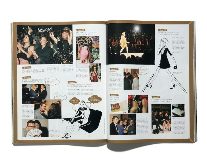 もし、空港で仕事の知り合いを見かけて も、迂闊に声をかけてはいけないらしい。 「Lesson 4 ビッグサングラスは『話しかけないで』のサイン」。なんと、では空港でアナ・ウィンター様をお見かけしても、ご機嫌伺いに上がるのはマナー違反ということか。もし、まだ機械化される前の入国審査の列で至近距離に並ぶ羽目になったらどうすれば? 無視するのも無礼だが話しかけるのも無礼となれば、アナ様の濃いサングラスのレンズに同化する黒ずくめのスタイルで彼女の視界から姿を消すしかない。忍者作戦である。これでファッションポリスの摘発は免れても、入国審査が長引きそうだ。着陸するなり無理難題ばかりで気が遠くなりそうだが、いざパリコレ会場に着くとこんどは剥き出しの生存競争が待ち受けている。会場の4人がけの椅子に6人分の席が用意されていたりするので極力詰めないと座れないのだ。編集部のカメラは、男性二人の間のわずかな隙間を両手の人さし指で指して「ここ、私の席です!」と主張している女性の姿を上から捉えている。パリコレでも仕事でも、自分の席をしっかり主張するのは重要だ。譲ってもらえるのを待っていると永遠に座ることができない。一方で、いくら近道だからといって自分の席を目指して聖なるランウェイを横切るなんてもってのほかだ。フロントローで組んだ脚を空中に突き出すなんてのも、モデルへのリスペクトに欠ける恥ずべき行為である。なるほど、基本は他者への敬意が必要ということか。ファッションの戦場では、人生訓にもなる気づきを得ることが多そうである。