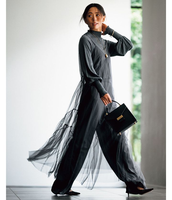 女っぽさの少量盛り+ベーシックカラーなら、ドレスアップした日もが自分らしさを保ち緊張感をほぐしてくれるんです。(スタイリスト・石毛のりえさん)