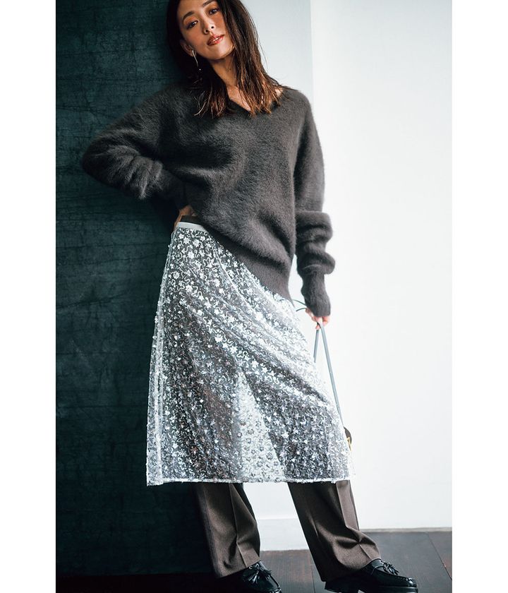 インパクトのあるアイテムも手持ちのベーシックなアイテムと合わせることでコーデが馴染むので、【1点盛り】がMYルール。地味色の流行りモノなら、浮かずにコーデ全体に品よく溶け込みます。シアースカートは着慣れたコーデに+1で、華やかさMAXの装いにアップデート。いつものパンツスタイルにレイヤードするだけでコーデの鮮度が劇的アップします。(スタイリスト・井関かおりさん)