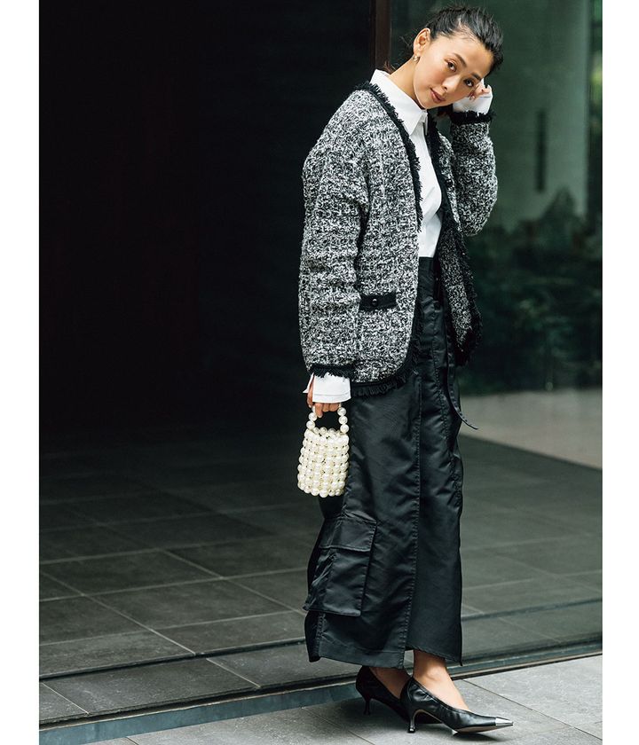 コンサバをベースにコーディネートを考える場合、【白シャツ】の持つ品の良さがいい仕事をしてくれます。日常より少しだけ特別感を出すのが理想。白シャツにツイード風ニットカーデを羽織ってきちんと感をプラスします。シルエットはオーソドックスをキープしつつワーク系の艶スカートで遊びを加えるのがキモ。(スタイリスト・竹村はま子さん)