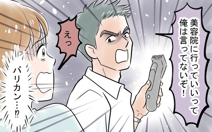 妻の服装に「男に媚びを売るな」「スカートをはくな」などなにかとケチをつける夫・龍生。中でも妻が美容院に行ったら激怒し、バリカンを手に妻を丸坊主にしようとする姿は恐怖!