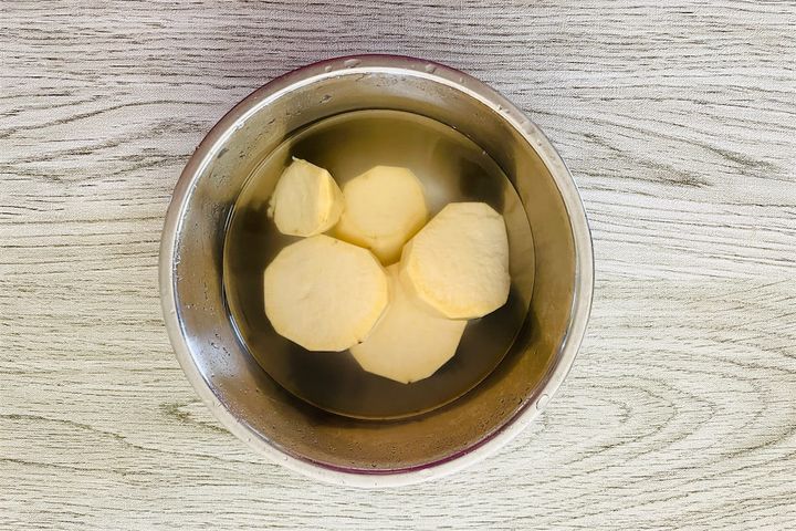 1.さつまいもは皮を剥き、2cmくらいの輪切りにして水にさらす。