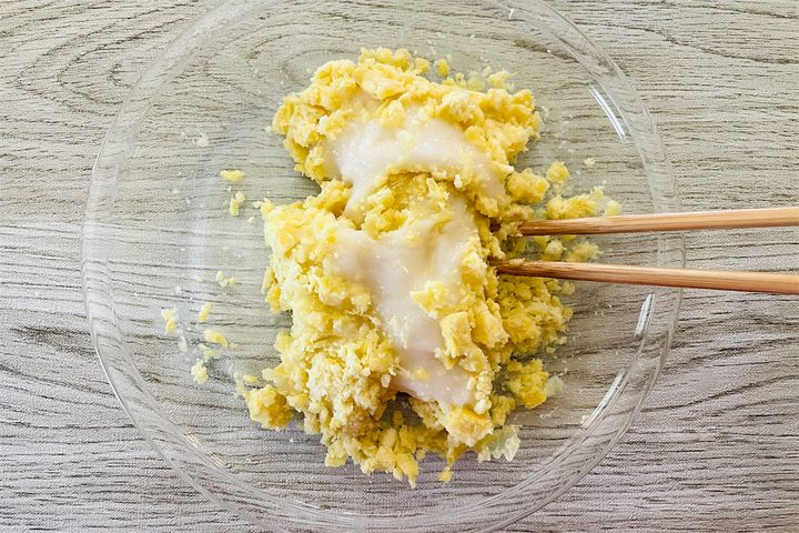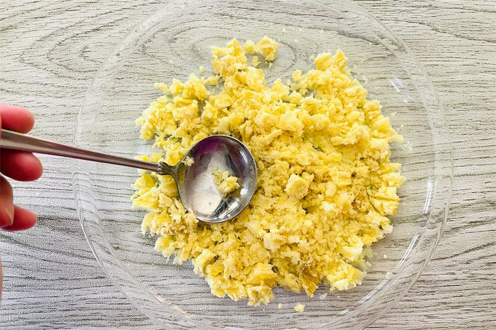 マッシャーの代わりにスプーンを使いました。塊をできるだけ細かくつぶします。