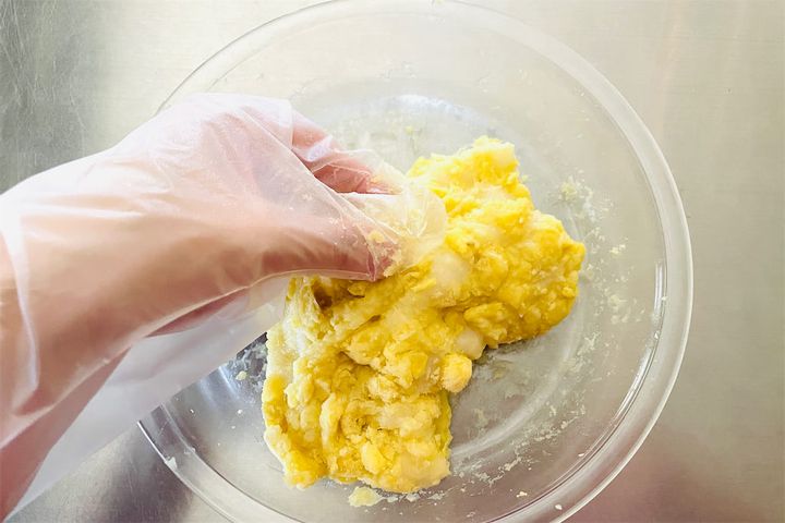 全体的に混ざったら手でまとめるようにして、食べやすい大きさにちぎります。