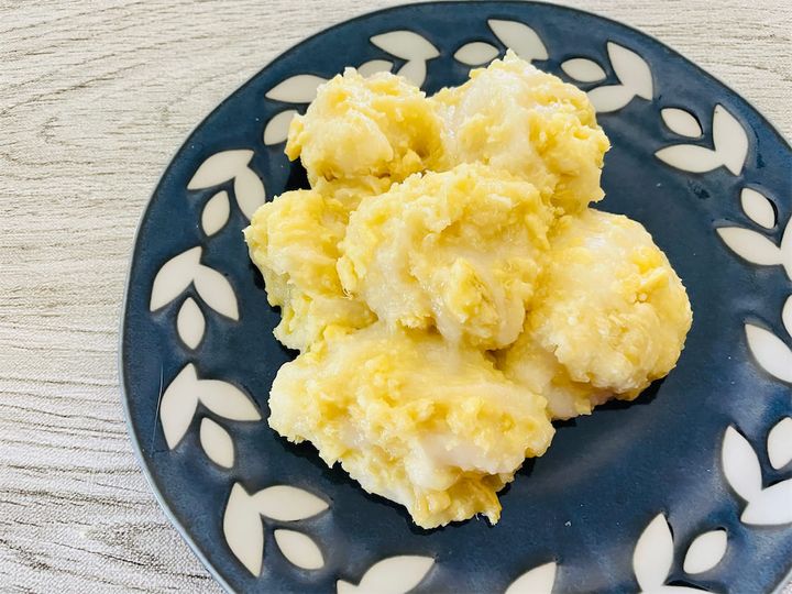 5. 3のつぶしておいたさつまいもに4の餅を混ぜ、食べやすい大きさにちぎって皿に盛り、混ぜておいた[A]をかける。