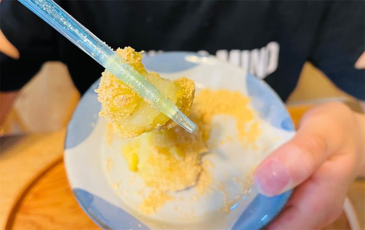 きな粉の中に入れた少量の塩が、さつまいもの自然な甘みを引き立ててくれています。