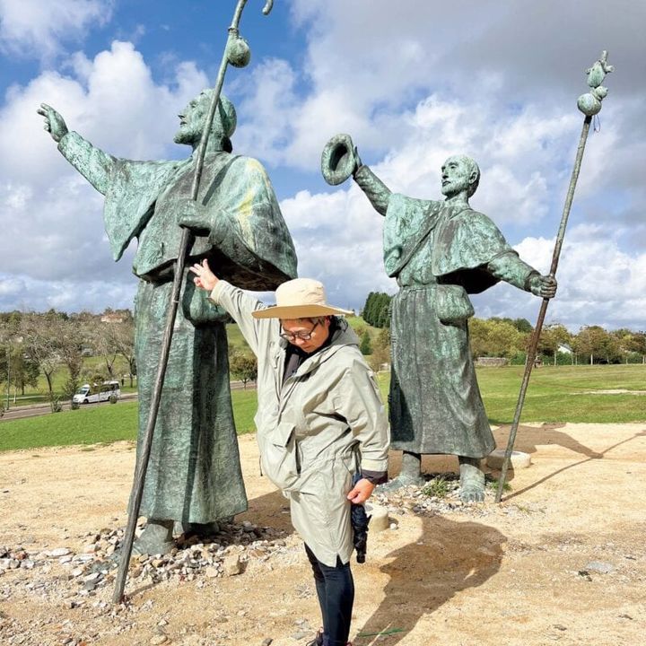 「ゴゾの丘」のモニュメントと記念撮影。「日本語で歓喜の丘という意味があります。東からやってきた巡礼者がここで初めて聖ヤコブの眠るサンティアゴ大聖堂の姿を見ることから、この名前がついたそう」。ゴールは目の前、あと5㎞!