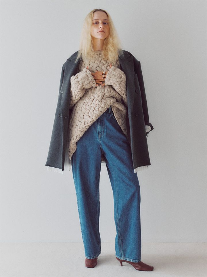 【POINT】テーラードジャケットならではのきちんと感と色落ちデニムのフランクさ。かけ合わせることで、お堅くもルーズにも転ばないバランスが完成。ボリュームニットのやさしい風合いと足元のボルドーで女らしさをひとさじ。
