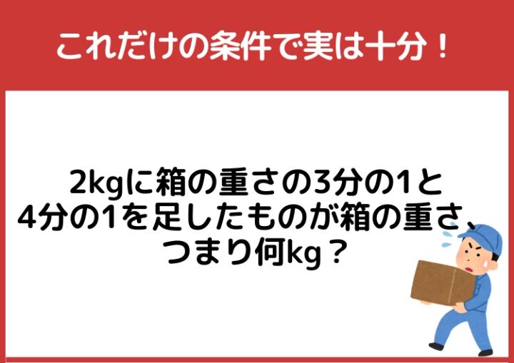 3. これだけの条件で実は十分!2kgに箱の重さの3分の1と4分の1を足したものが箱の重さ、つまり何kg?