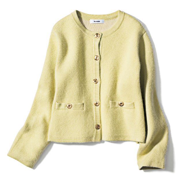 軽やかにまとえるふわふわフラッフィー素材。ノーカラーの上品なニットジャケットは、フロントのゴールドボタンがリッチなアクセント。