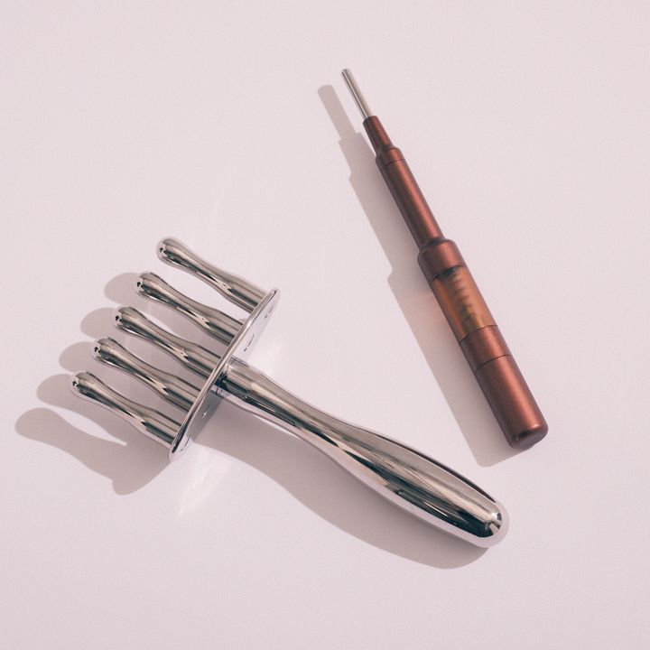 左:カッサは重みがあって肌の上で心地良く滑ります。右:フェイスポインターは移動中に愛用。夫もユーザーです。
