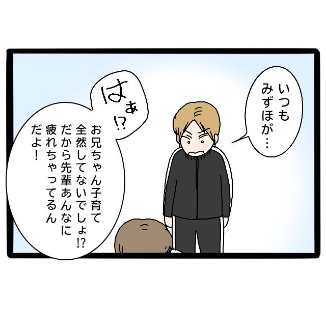 「まさかお兄ちゃん、つむちゃんをお風呂に入れたことないの?」カオリさんにそう聞かれた憲一さんは、「いつもみずほが・・」と答えました。「はぁ!?お兄ちゃん、子育て全然してないでしょ!?だから先輩あんなに疲れちゃってるんだよ!」「先輩があんなにやつれていたのはお兄ちゃんのせいだ!」カオリさんはそう思いました。