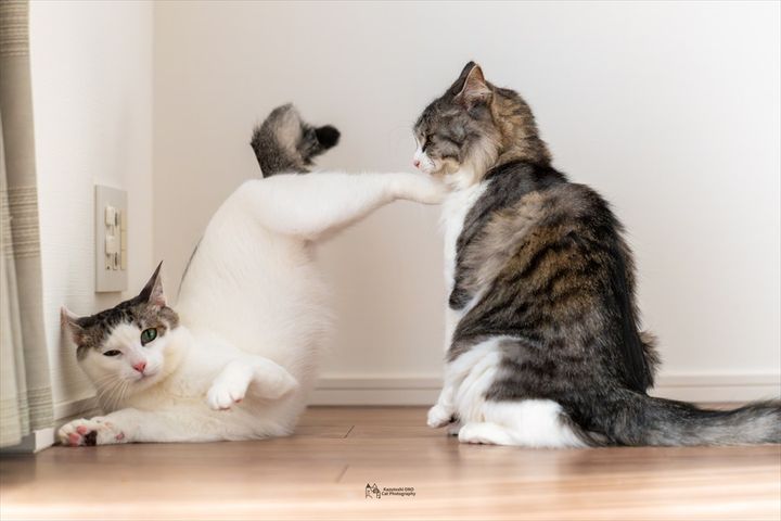 日頃から取っ組み合いのケンカをしているそうで、これはジンくんが逃げる体勢に入った時の写真だそうです。 2匹でいると何かが起こるといい、その瞬間を撮ろうと狙っていたという小野さんは、「まさかこのような瞬間を撮影できるとは思いませんでした」と話されていました。