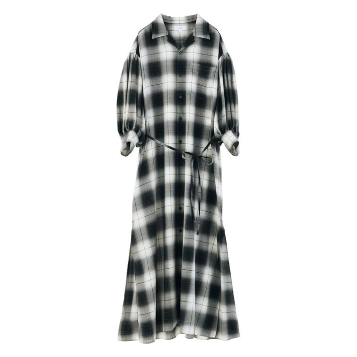 〈ハイク〉の2025年春夏コレクションから、1950年代のオープンカラーシャツを着想源にしたワンピースを。アメカジ調のチェック柄でマニッシュさを残しつつ、ふんわりとしたバルーンスリーブや裾の深いスリットにより、ドレスライクな仕上がりに。透け感のあるウールとポリエステルの混紡素材で、空気をはらんで揺れる様子も印象的。