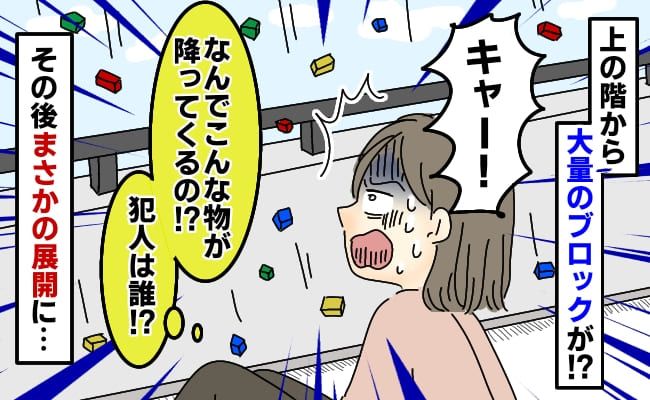 わが家はマンションの4階に住んでいます。ある日の休日にベランダで洗濯物を干していると、上の部屋から騒がしい音が。休日だし子どもが遊んでいるのだろうと思った矢先、突然大きな音とともに、大量の小さなブロックが降ってきたのです! 私は恐怖のあまりマンション中に響き渡るほどの大きな声で「キャー!」と叫んでしまいました。ブロックは一部がうちのベランダに、残りは1階の緑地に落ちています。下を見下ろすと幸い人に当たっている様子はありませんでした。