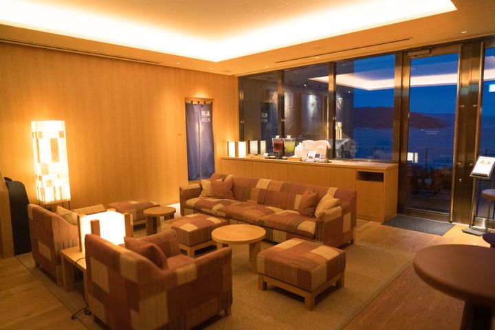 綺麗なオーシャンビューが特徴的なお部屋ですが、夜になっても趣のある空間でゆったりすることができます。ダウンライトの温かみのある光や、間接照明が落ち着いた雰囲気を演出しています。