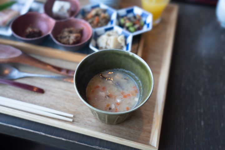 野菜をたっぷり入れ、ご飯に合うようにショウガを隠し味に、白味噌の和風仕立てになっていて絶品です。