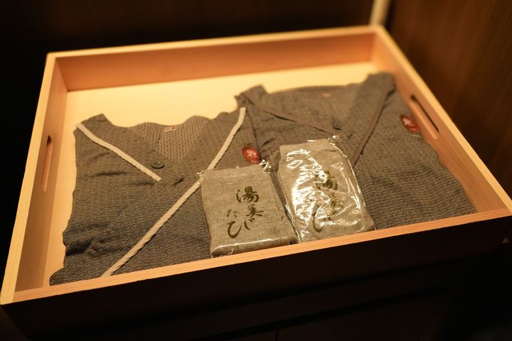 丁寧に包まれた青色の風呂敷をあけると、歯ブラシなどのアメニティが。ちなみにこの風呂敷は、持ち帰っても、宿泊中に自由に使用してOKということで、大浴場に行く際の小物入れとしてとても重宝しました。