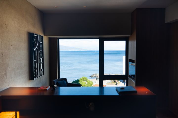 お部屋は、ローベッド&ソファの快適空間に、太平洋を一望できる大きな窓が。窓から差し込む自然光と青い海の景色が、まるで絵画のような癒しの空間を演出しています。朝陽が海面を照らす時間、夕暮れ時の太陽が沈む瞬間など、時間帯によって変わる景色を眺めながら、ゆったりと流れる贅沢な時間を楽しむことができます。