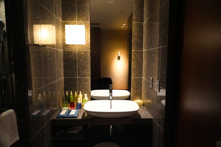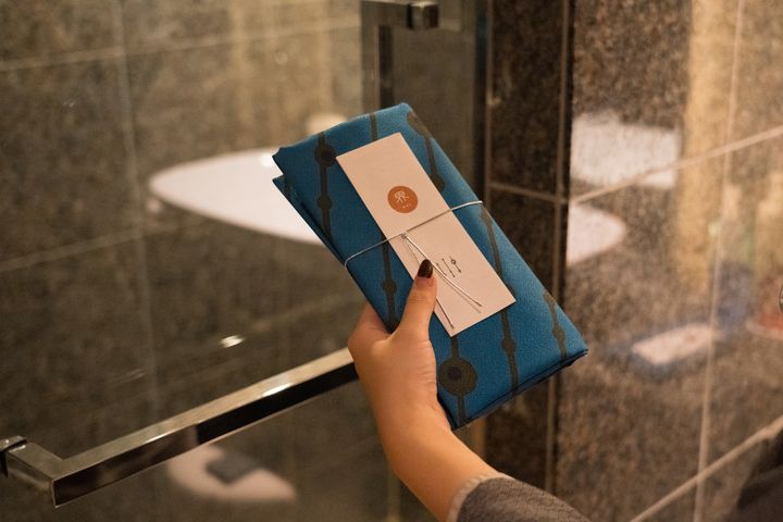 お部屋のバスアメニティは、全て宿オリジナル。特に目を引いたのは、 風呂敷付きのアメニティグッズです。