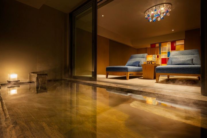 全16室の客室は、露天風呂付きや源泉かけ流しの内風呂付きなど、それぞれ趣の異なる意匠が凝らされている。滞在中、自由にドリンクや軽食を楽しむことができる、オールインクルーシブのラウンジも魅力だ。
