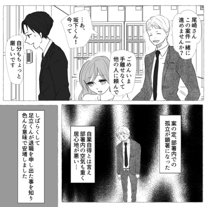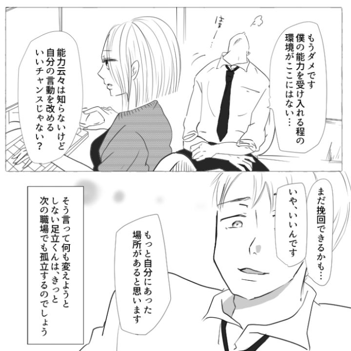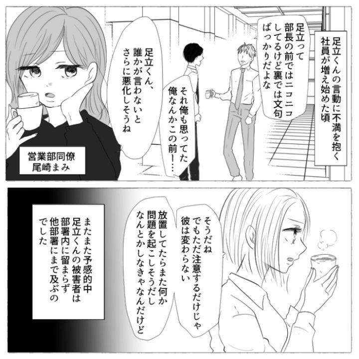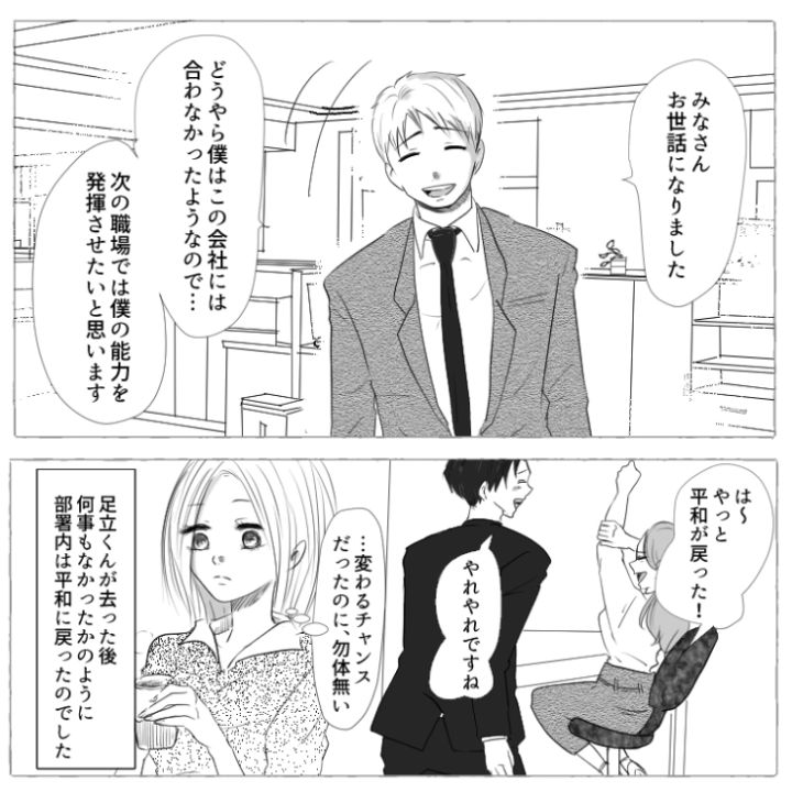 周りに避けられ始めてもなお「自分を受け入れられるような環境がない」と環境のせいにして反省しない足立。結局退職することになり、職場には平和が戻ったのでした。