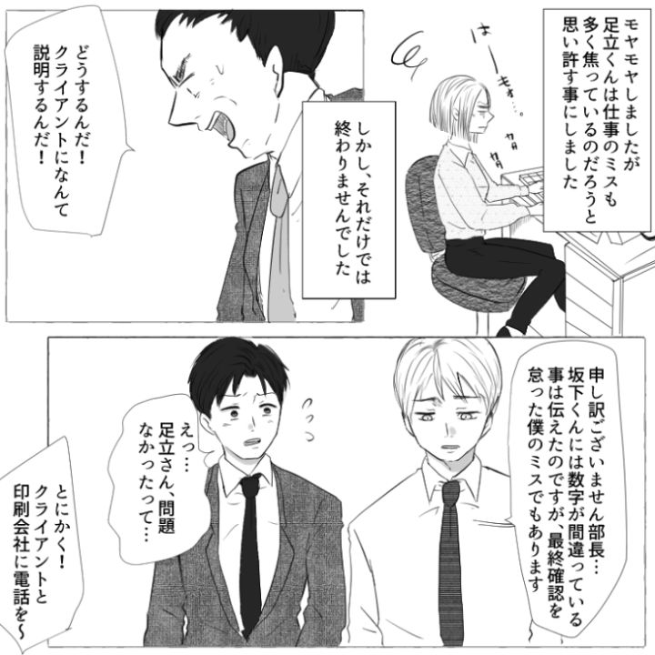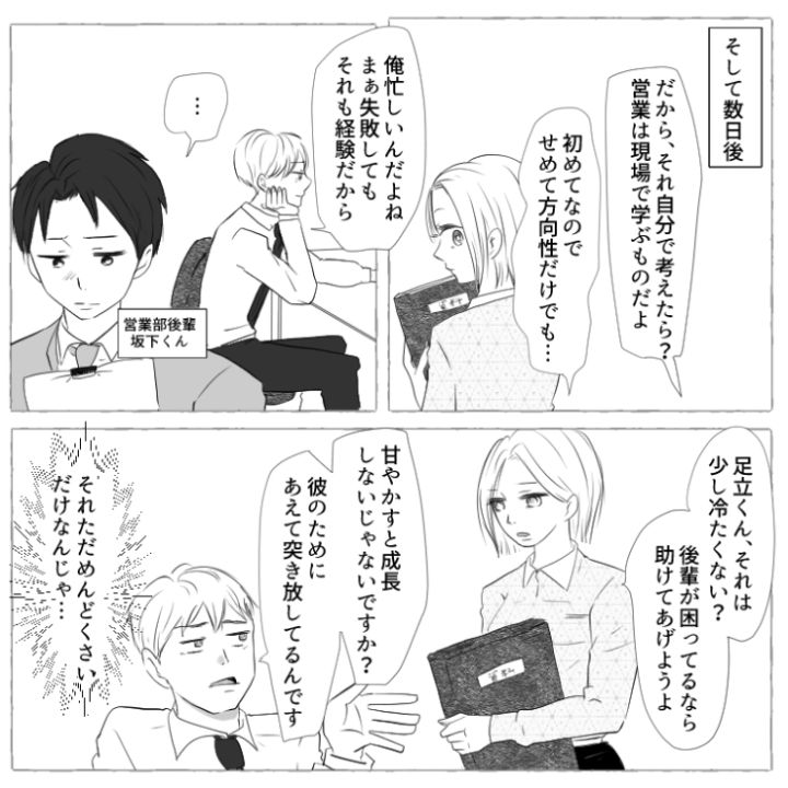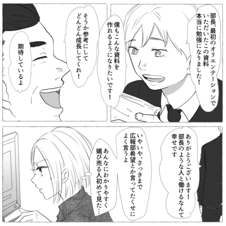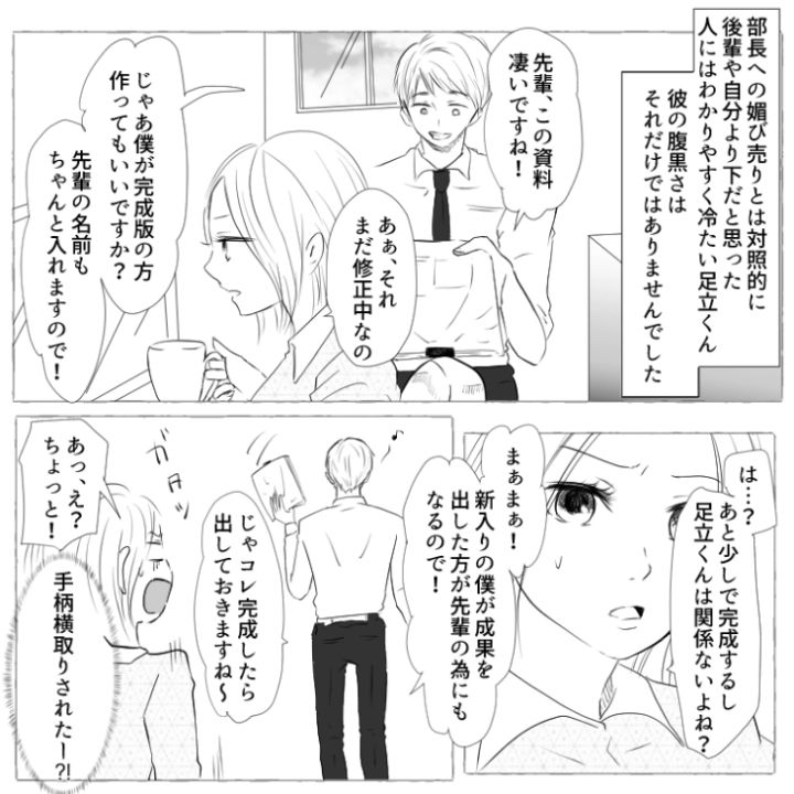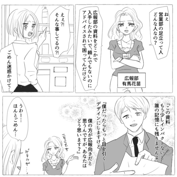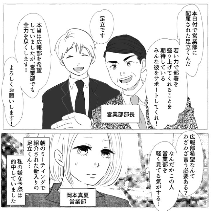 営業部に異動してきた足立。初日の挨拶で「本当は広報部を希望していた」という余計な一言を言い、早速違和感を感じる主人公。その違和感は確かなものとなっていくのでした・・・。