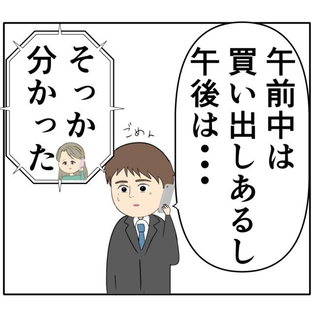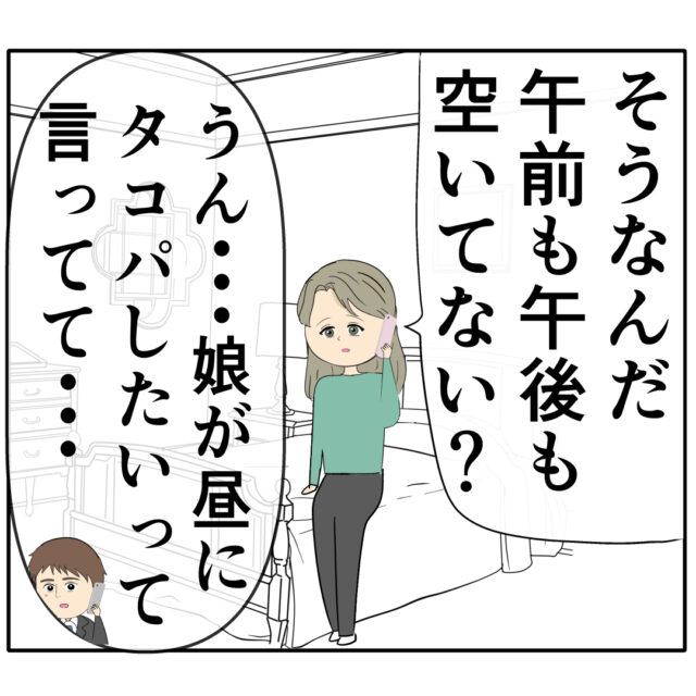 「そうなんだ。午前も午後も空いてない?」と食い下がるジュリ実さんに「うん・・・娘が昼にタコパしたいって言ってて・・・」と申し訳なさそうに答えるろみ緒さん。