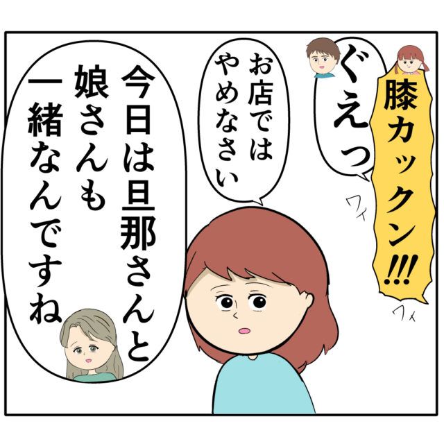 「膝カックン!!!」「ぐえっ」といつものやり取りをする2人に「お店ではやめなさい」とめいさんが冷静に伝えていると、「今日は旦那さんと娘さんも一緒なんですね」と声をかけられました。