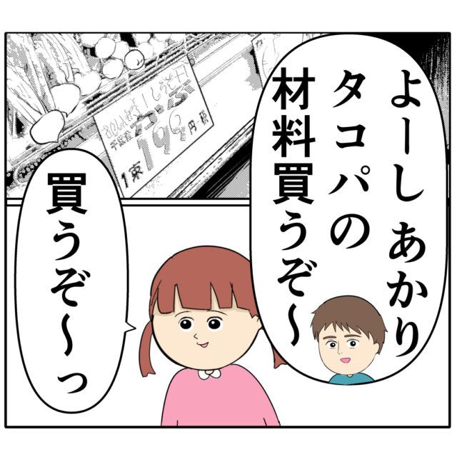 翌日、タコ焼きパーティーの買い出しのためスーパーへ行ったろみ緒さん一家。「よーし、あかり。タコパの材料買うぞ~」「買うぞ~っ」と和気あいあい。