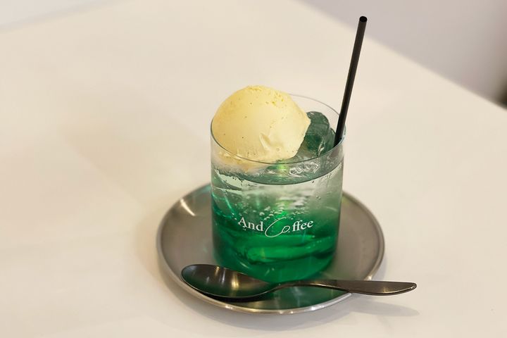 デザート感覚で楽しむなら「メロンクリームソーダ」がおすすめ。シロップ×ソーダの透明感と、ステンレスのソーサーがシックなムードを演出しています。思わず写真に収めたくなるようなビジュアルも魅力です。