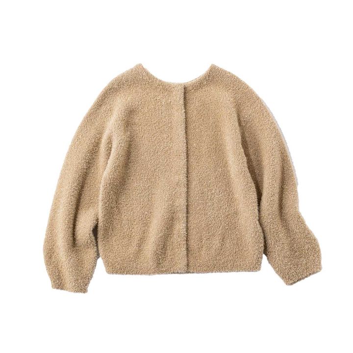 トレンドど真ん中のラメ感と少し肉厚なフェザーヤーン素材で装いが華やぐ。羽織ったり巻いたり自在に使える。¥9,990(PLST)