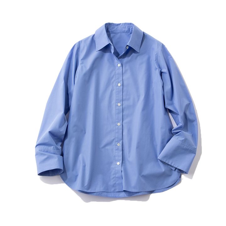 定番のシャツは、今季はベーシック色もシャイニーカラーも受け止めてくれる、爽やかなブルーシャツが正解。¥13,200(ノーク)