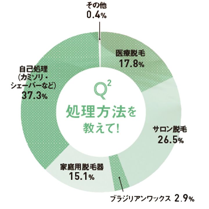 永久脱毛完了済みの人もいるけど、実はまだまだ自己処理派も多い。同時に、ワキや脚は医療脱毛済みで、腕や顔などの毛は自己処理という人も。