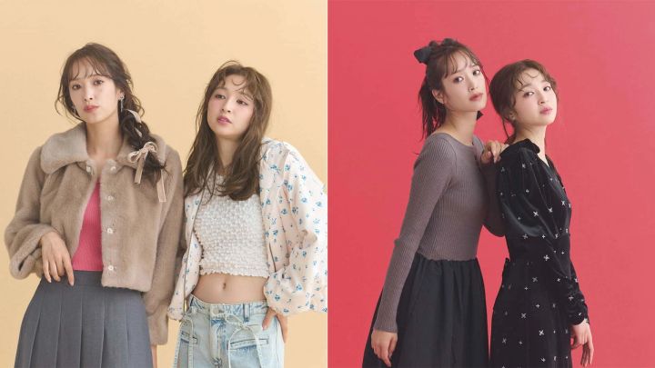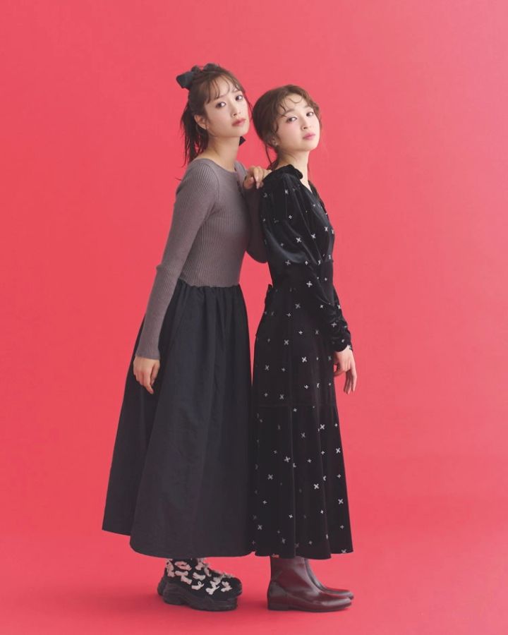 〈左・久美〉ニットワンピース 9,900円/マリークヮント×パブリュクス(デイトナパーク)ブーツ 24,200円/HONEY MI HONEY ヘアリボン/スタイリスト私物〈右・星来〉黒ベロアワンピース 参考商品/REDYAZEL ルミネエスト新宿店 イヤリング 2,090円/GOLDY ブーツ 24,200円/A de Vivre