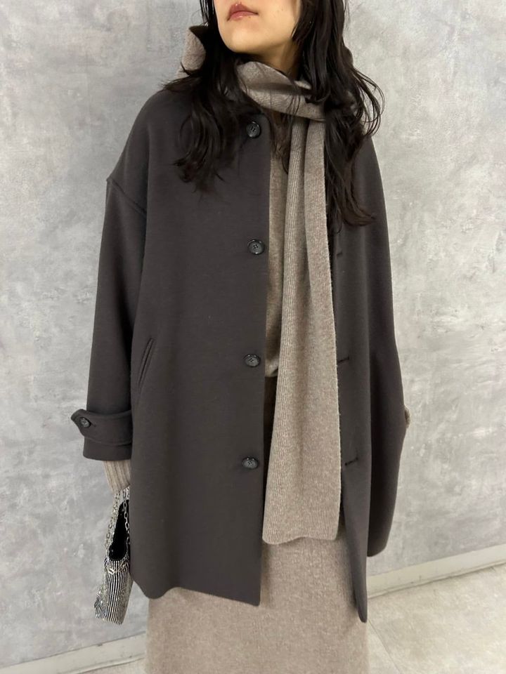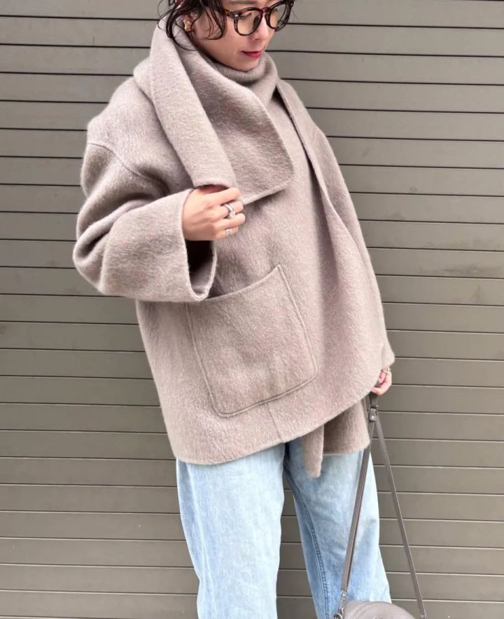 「さらっとカーディガン感覚で羽織れるコートです。片方の襟にストールがくっついたようなデザインが印象的で、寒いときはグルっと巻きつければ首元までしっかり防寒してくれるので、おしゃれかつ実用的! 腰まで隠れる安心丈でパンツにもスカートにも合わせやすく、今年のヘビロテアウターになっています」ライター・エディター出原杏子さん