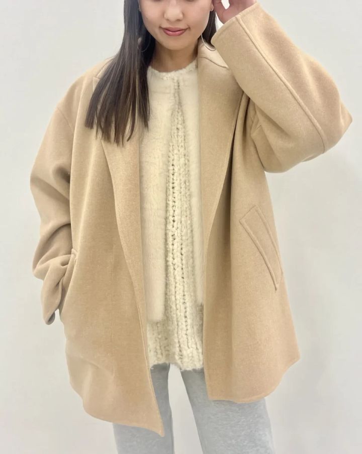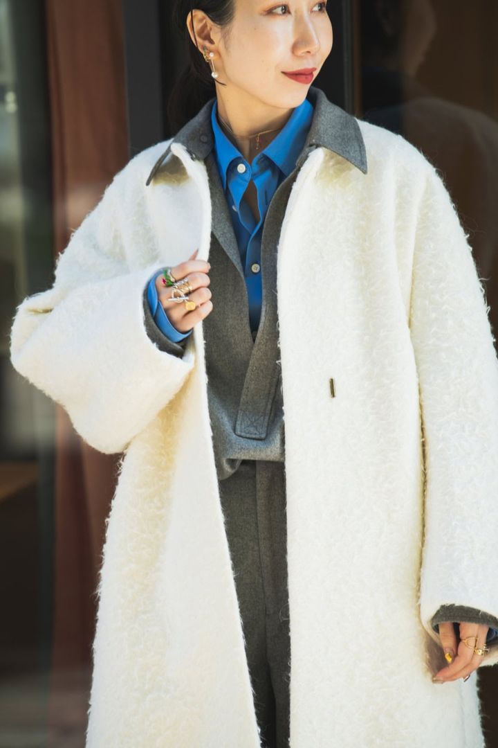 「ウールの比率が高いシャギー素材で仕立てた品のいいアウター。短めの丈感と首まわりのスッキリ具合が上品で気に入ってます。ワイドデニムでカジュアルに着くずすのが今の気分です」 miies miimディレクター前坂美結さん
