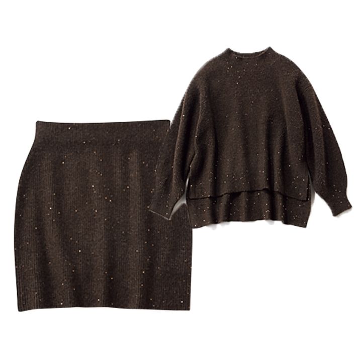 前短後長のニットトップスとミニスカートのセットアップ。この冬、ひと揃え持っておきたい。¥24,200(マイストラーダ プレスルーム)