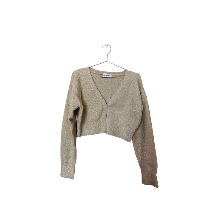 ラメが入っているゴールドのようなイエローのようなショート丈カーディガン。
