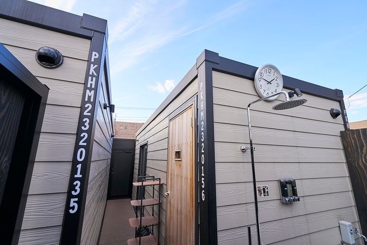 扉を開けると、手前のシャワー室、奥のサウナ室、突き当たりの外気浴スペースしかないプライベートな空間です。天井がないトレーラーハウス造りで、開放感たっぷり。気持ちのいい外気を感じながら、サウナを楽しむことができます。天井のない外の空間ですが、しっかりと壁で覆われているトレーラーハウスなので、周りから見える心配はありません。