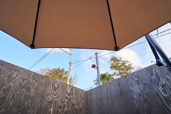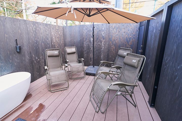 周辺の喧騒を耳にしながらの、ととのいタイム。向かいに幼稚園があるので、時間帯によっては園児たちの声が響いて、ほのぼの。インフィニティチェアに寝転んで上を見上げると、高い空と木々だけ。大きめのパラソルが日よけになり、直射日光が当たらずにリラックスできます。