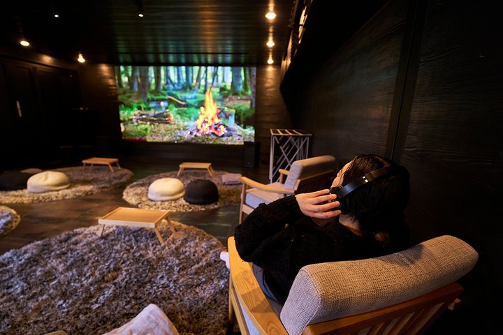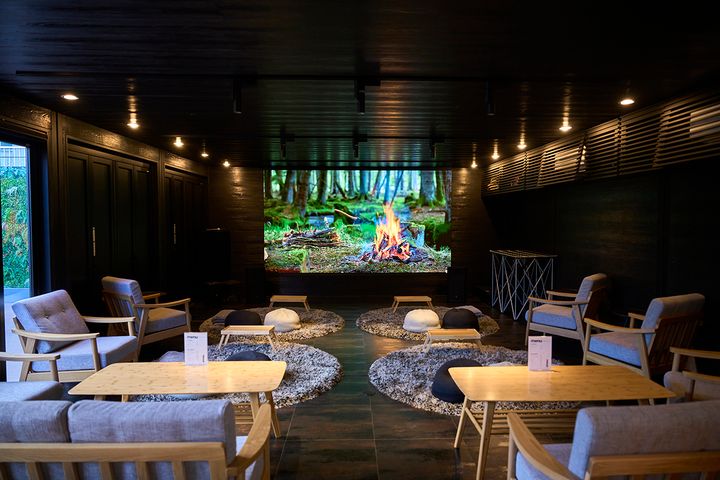 映画が上映されていないときは環境音楽や自然の様子が常に流れています。取材時は、焚き火の映像が流れていました。パチパチという焚き火の音が、まるで目の前で焚き火をしているように、耳からダイレクトに伝わってきます。