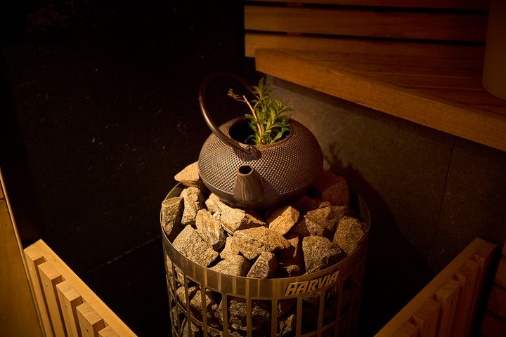 もう一つのサウナは、少しコンパクトな造り。ベンチがらせん階段状になっていて、ロウリュから出る蒸気がまわりやすい設計になっています。ロウリュの石の上には鉄器の急須がのっていて、中にはデッキで栽培している詰みたてのハーブを入れてもらえます。