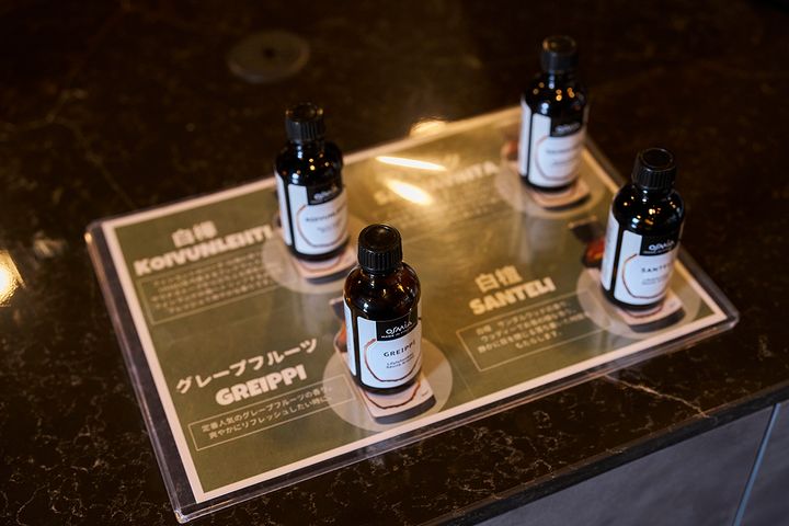 貸切利用専用のプライベートサウナに入る場合は、ロウリュに垂らすアロマオイルを選ぶことができます。こちらで使用しているのは、「OSMIA(オスミア)」という、フィンランドのブランドのサウナ専用のアロマ。フィンランドの森を思わせるフレッシュでさわやかな香りの「白樺」、定番人気の柑橘系の香り「グレープフルーツ」、白樺の枝葉を束ねた少しスモーキーなニュアンスの「ヴィヒタ」、落ち着けるウッディなサンダルウッドの香り「白檀(びゃくだん)」の4種類です。
