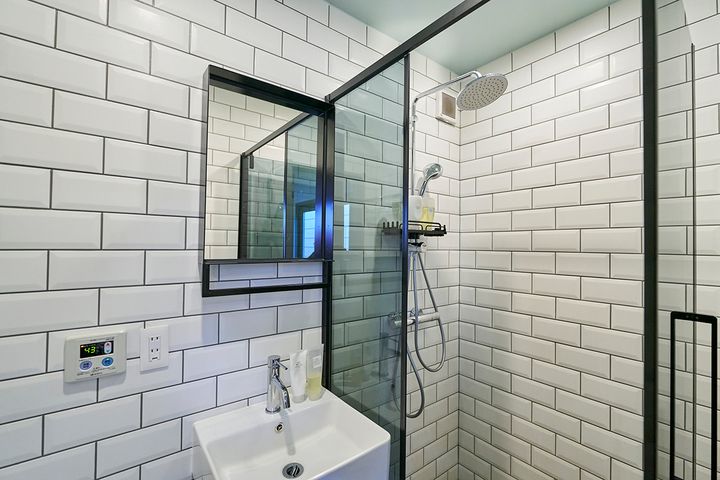 こちらが洗い場です。モダンな雰囲気で、トレーラーハウスの中にあるとは思えないぐらいおしゃれ。